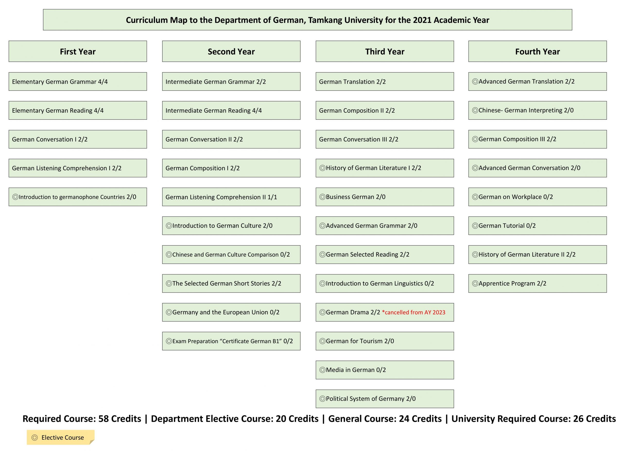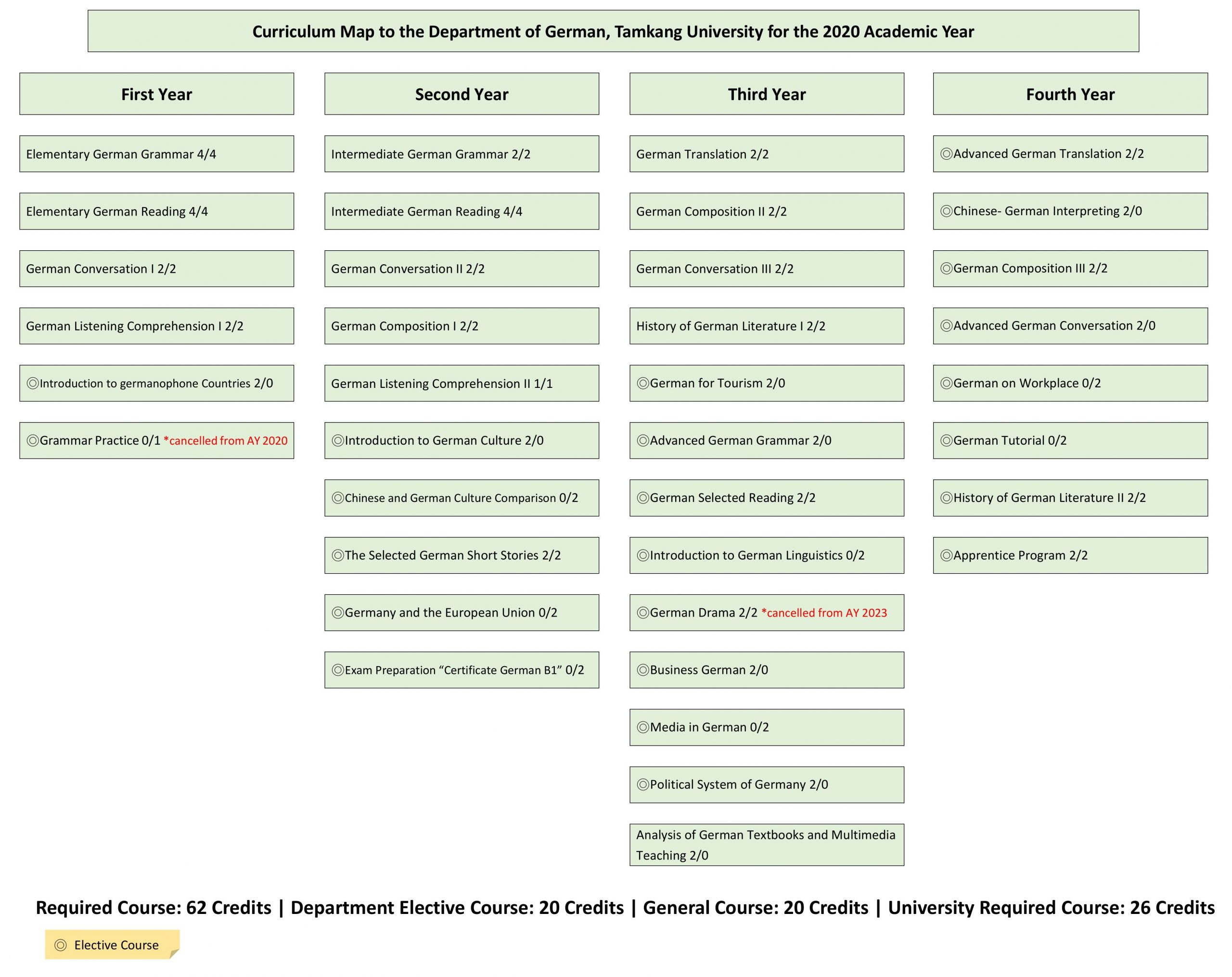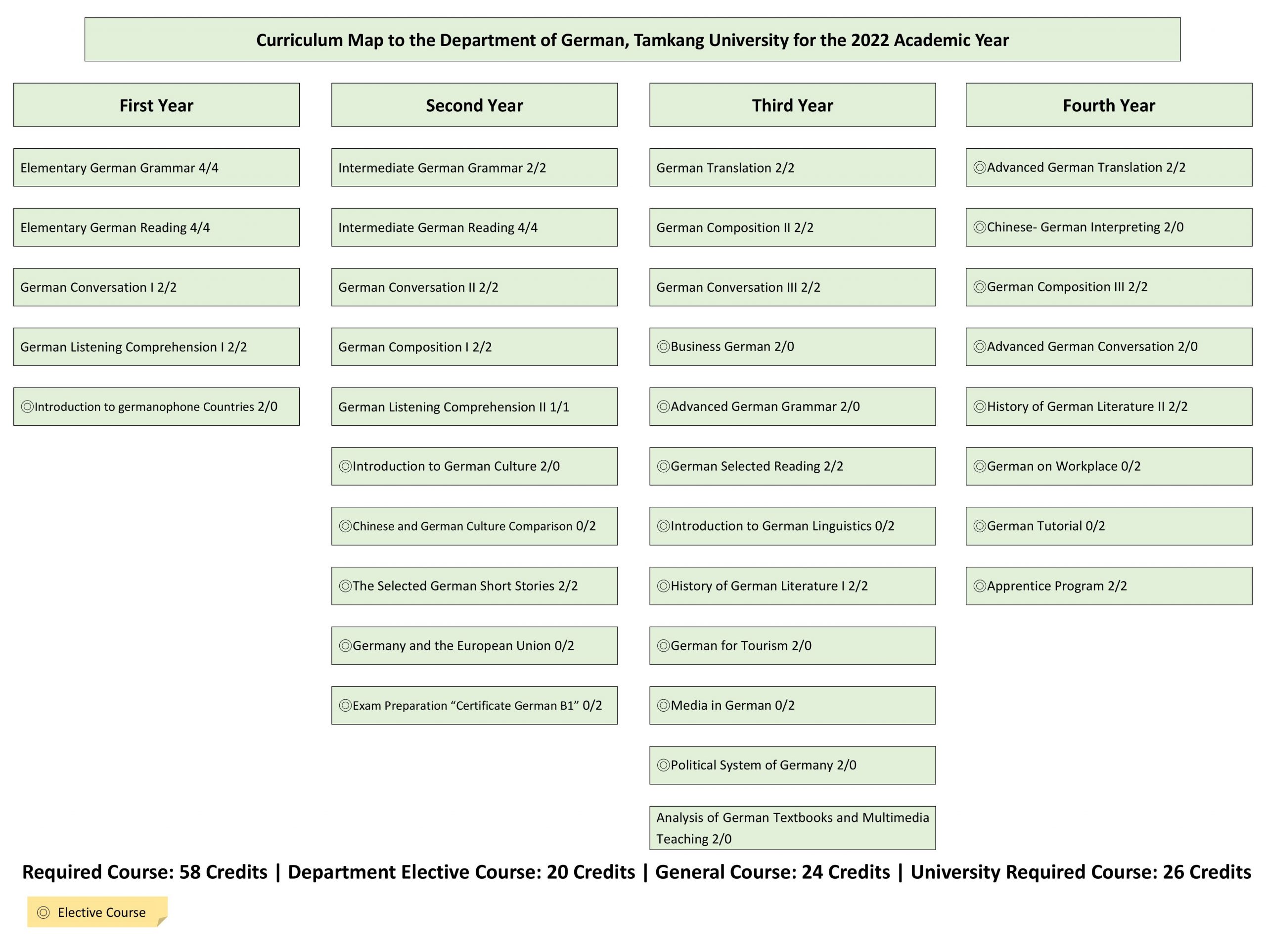 本組以語言、人文、實務及跨學科(校必選修)四個領域規劃課程: 大一、大二著重基礎德語的訓練,大三、大四專業進階德語與實務能力的培養。
