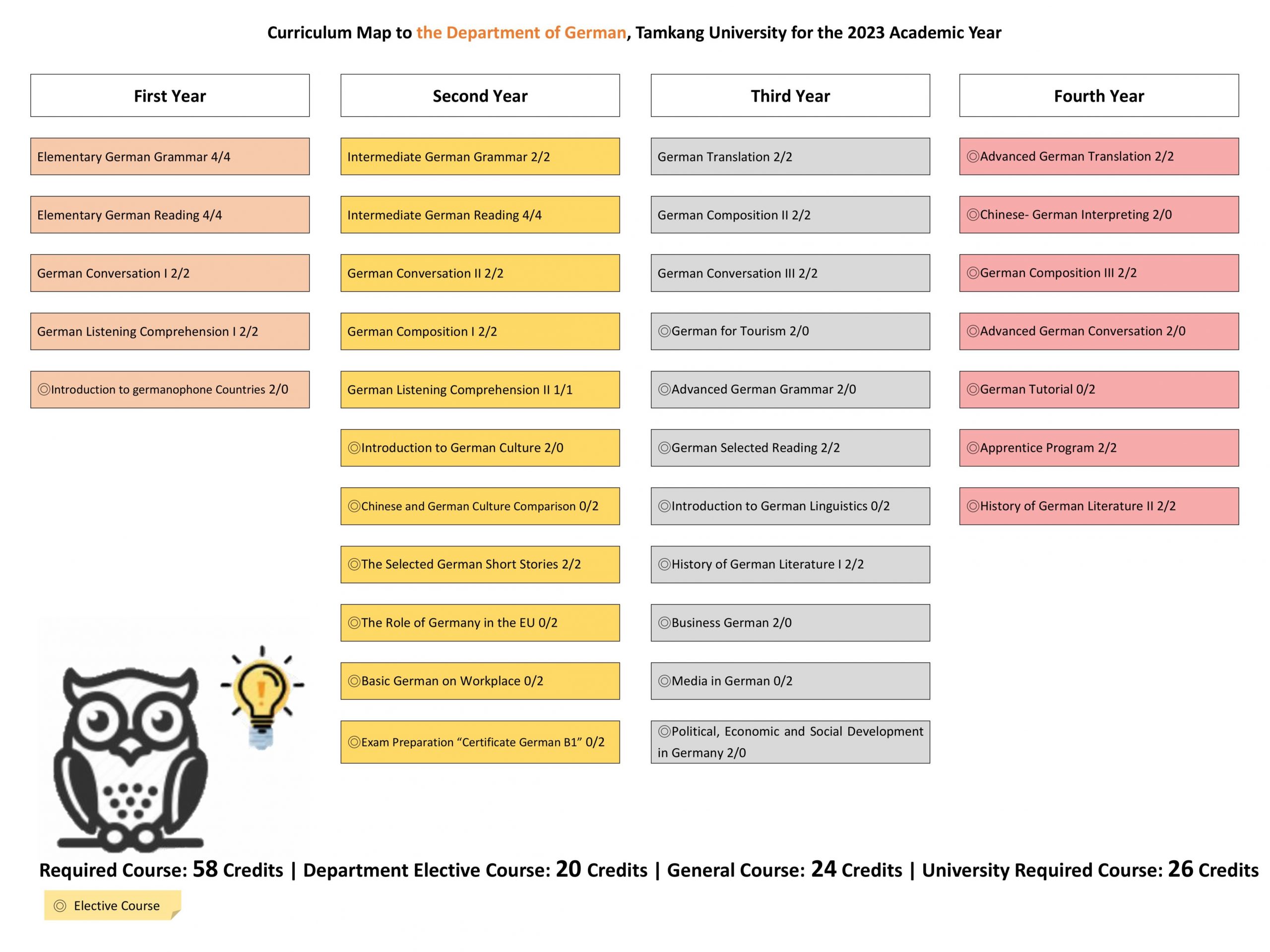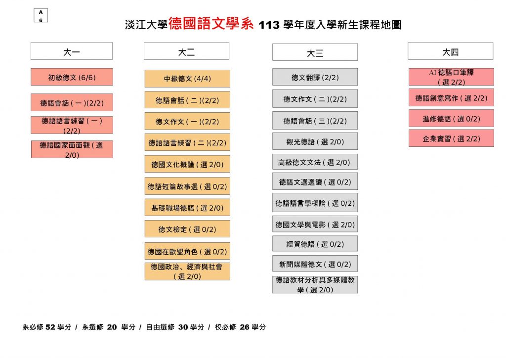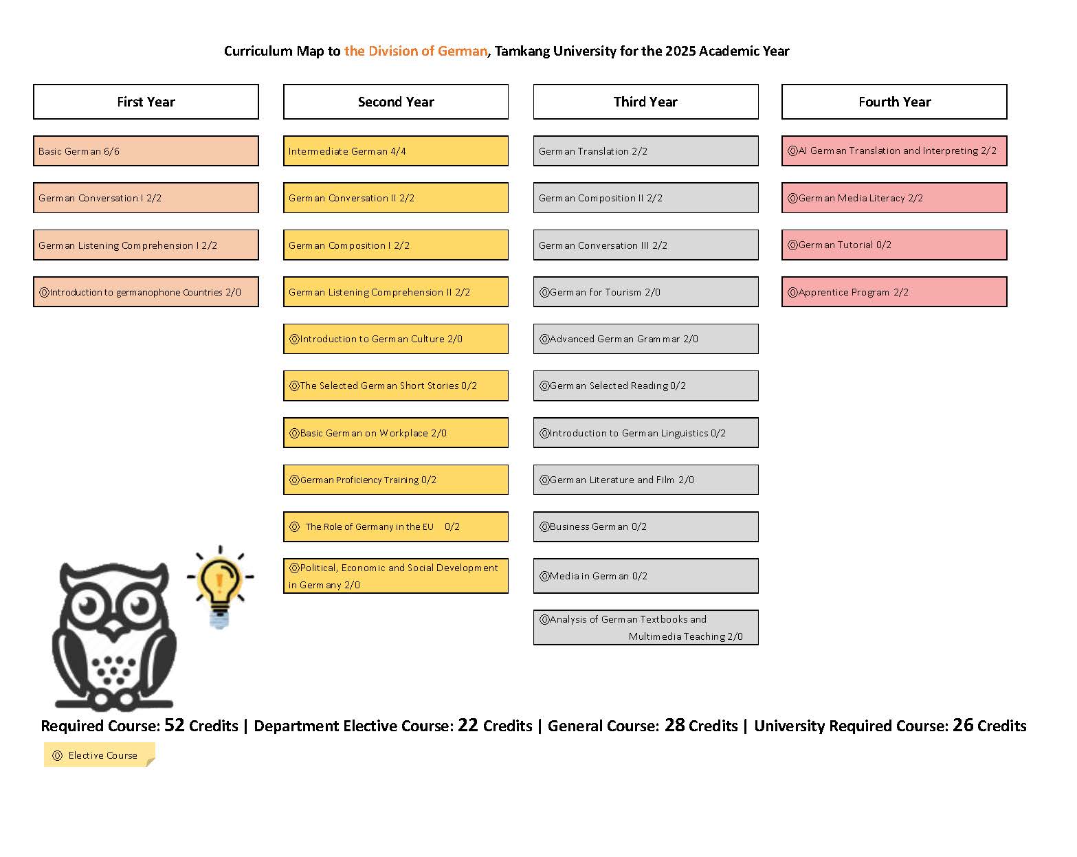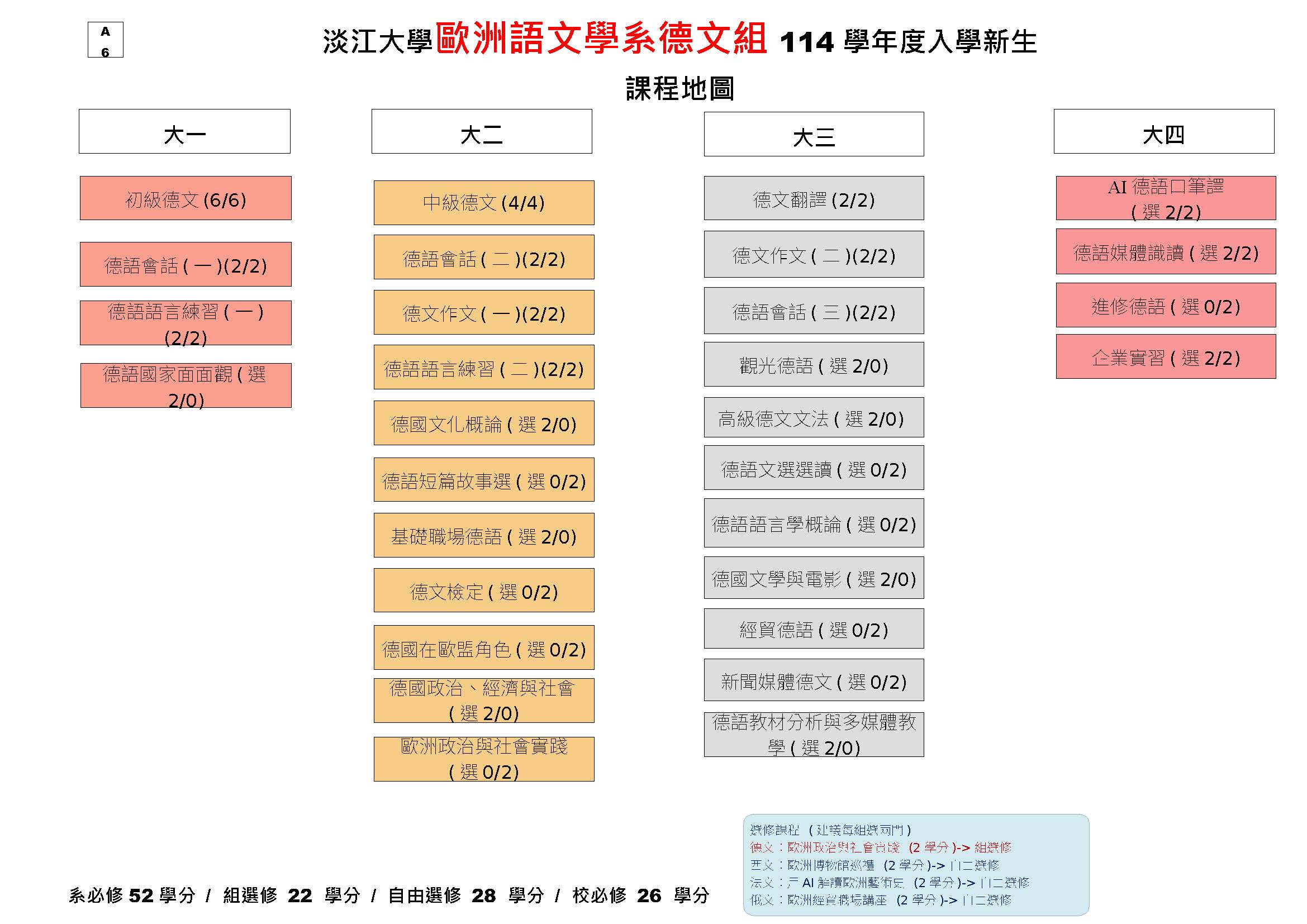 本組以語言、人文、實務及跨學科(校必選修)四個領域規劃課程: 大一、大二著重基礎德語的訓練,大三、大四專業進階德語與實務能力的培養。